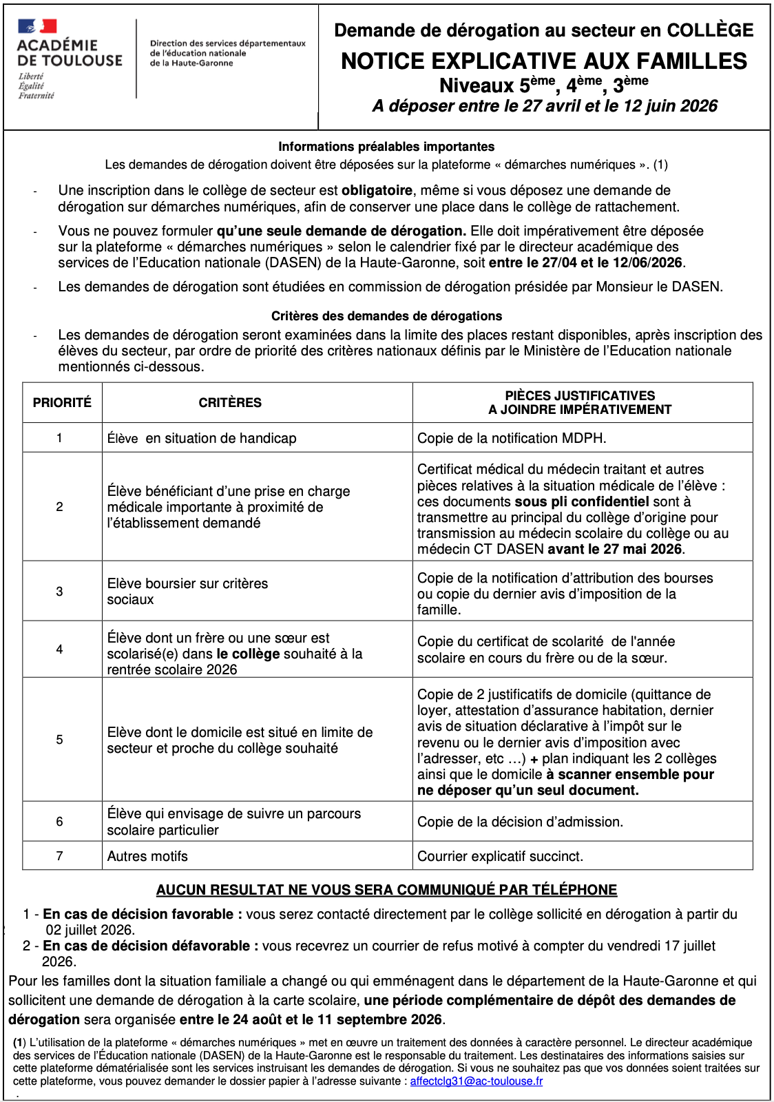 Le lien d’accès à cette plateforme sera ouvert entre le 27 avril et 12 juin 2026 : https://demarche.numerique.gouv.fr/commencer/demande-de-derogation-au-secteur-dans-un-college-p-2.