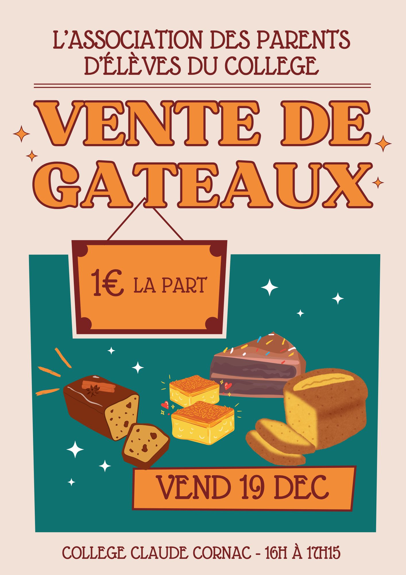 Le vendredi 19 décembre à 16h, des parents d'élèves vendront des parts de gâteaux à 1€ pour aider au financement de projets et sorties (voir affiche)